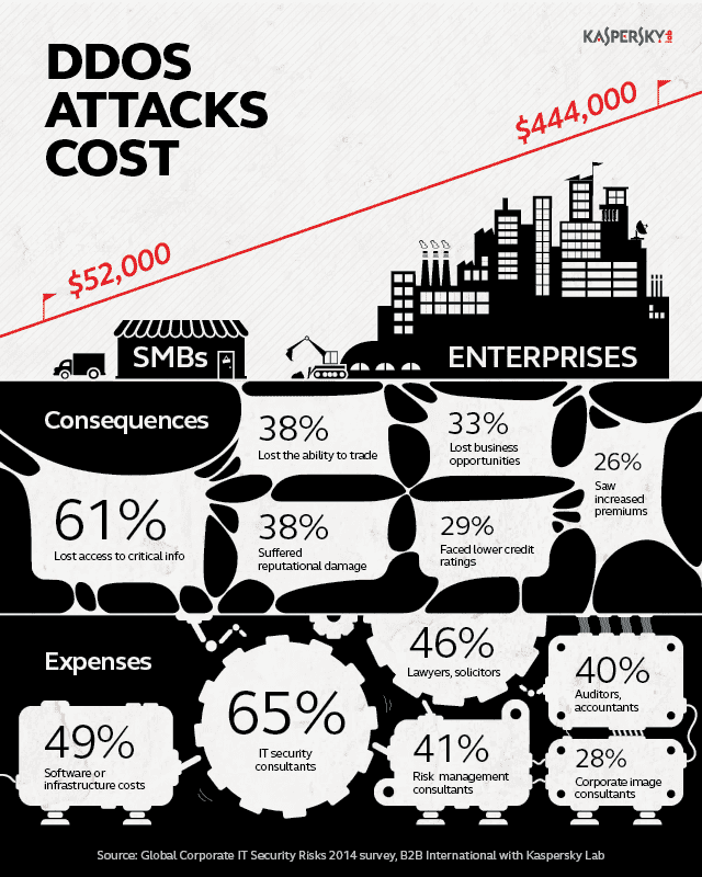 According to the results of astudyconducted by Kaspersky Lab and B2B International, a DDoS attack on a company’s online resources might cause considerable losses – with average figures ranging from $52,000 to $444,000 depending on the size of the company. For many organizations these expenses have a serious impact on the balance sheet as well as harming the company’s reputation due to loss of access to online resources for partners and customers.