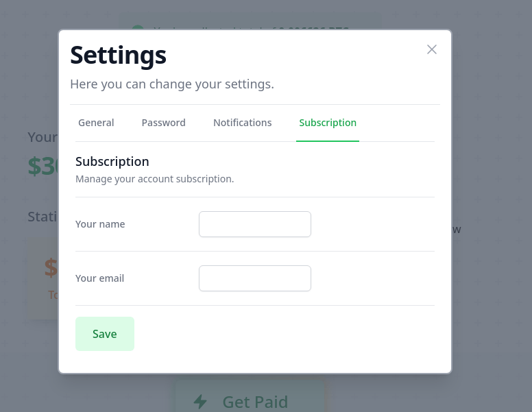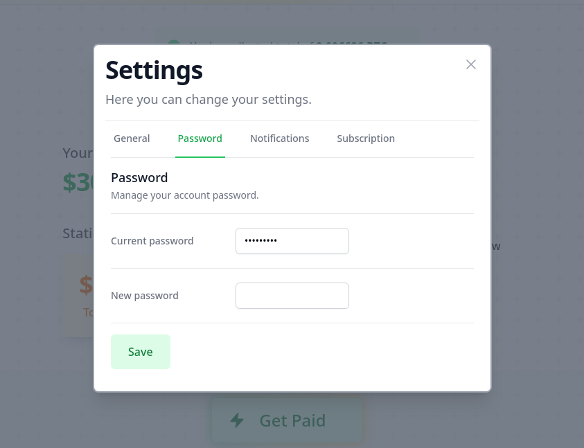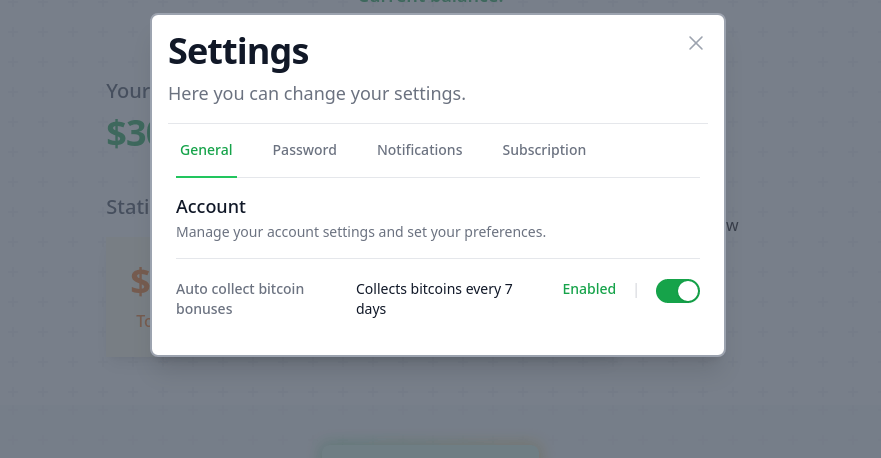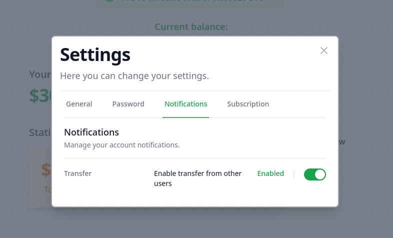 Es gibt einen „Einstellungsbereich“ zum Ändern des Passworts, zum Abonnieren verschiedener Dienste, zur Aktivierung der automatischen Auszahlung von Geldern (wobei nicht angegeben wird, wohin) und sogar die Möglichkeit, anderen Nutzern der Plattform Geld zu schicken ( aus unerfindlichen Gründen unter der Registerkarte Benachrichtigungseinstellungen).