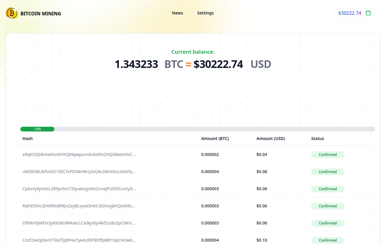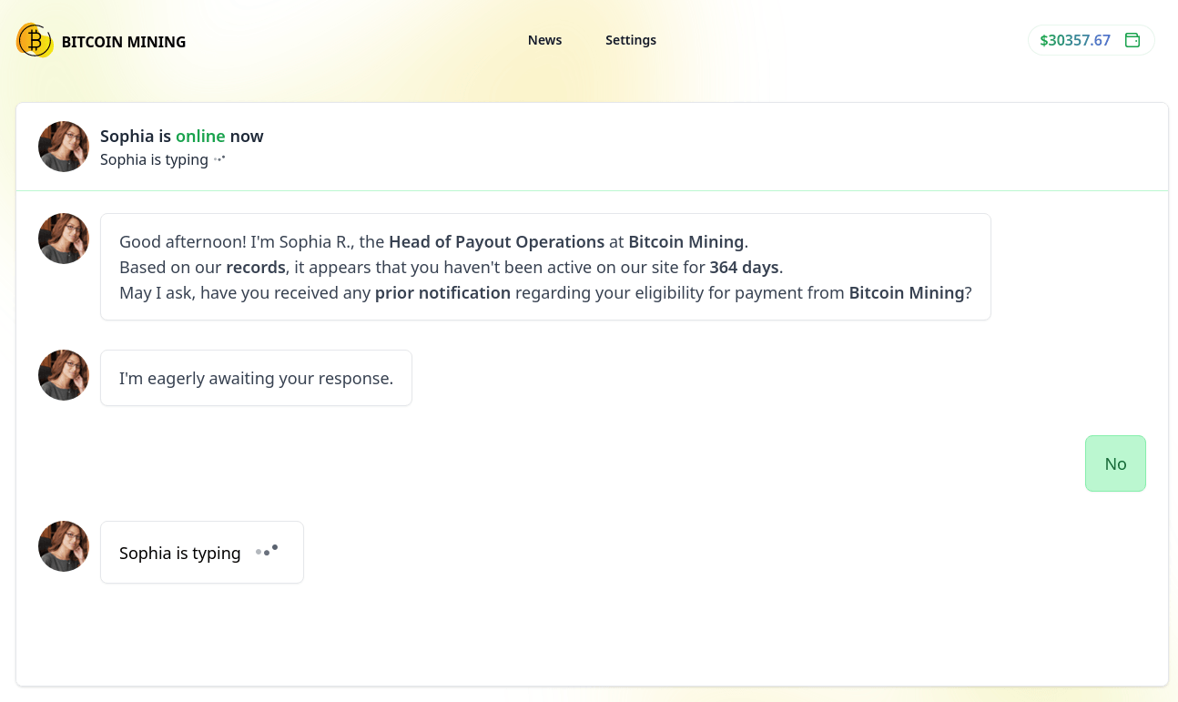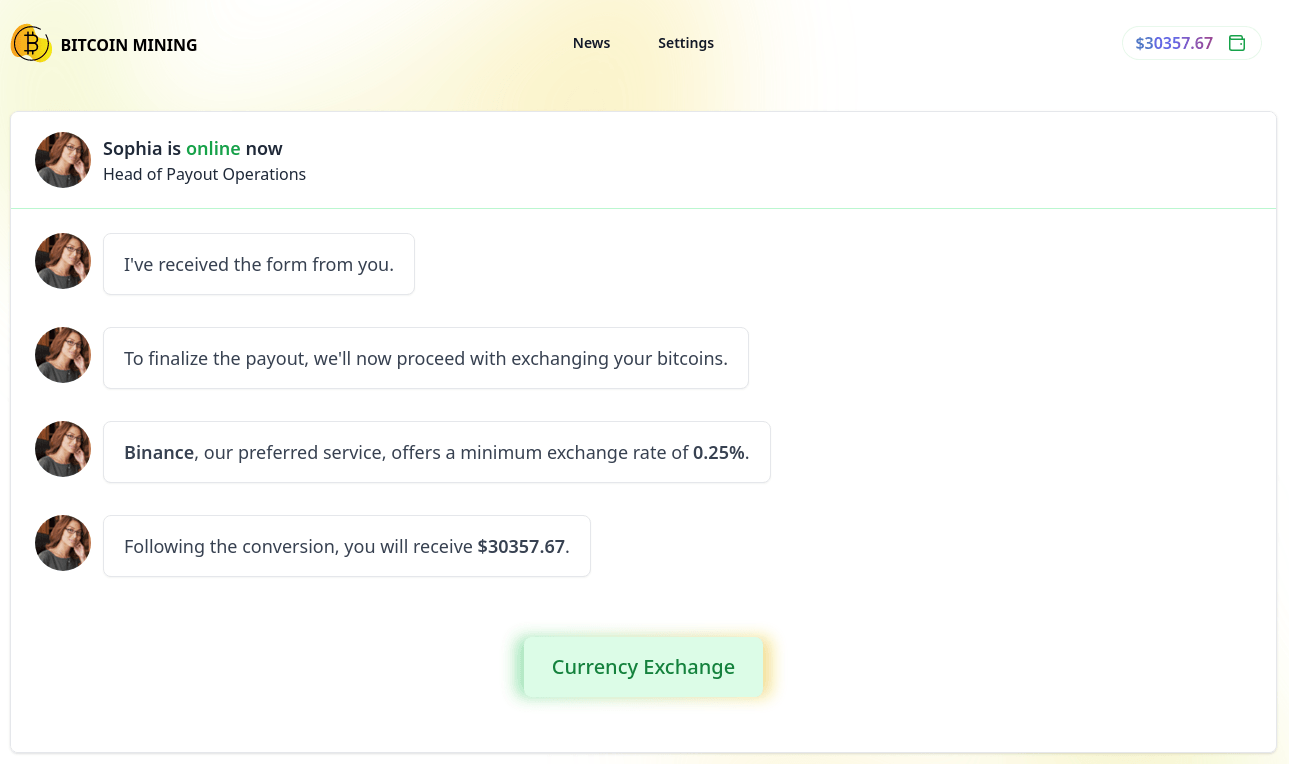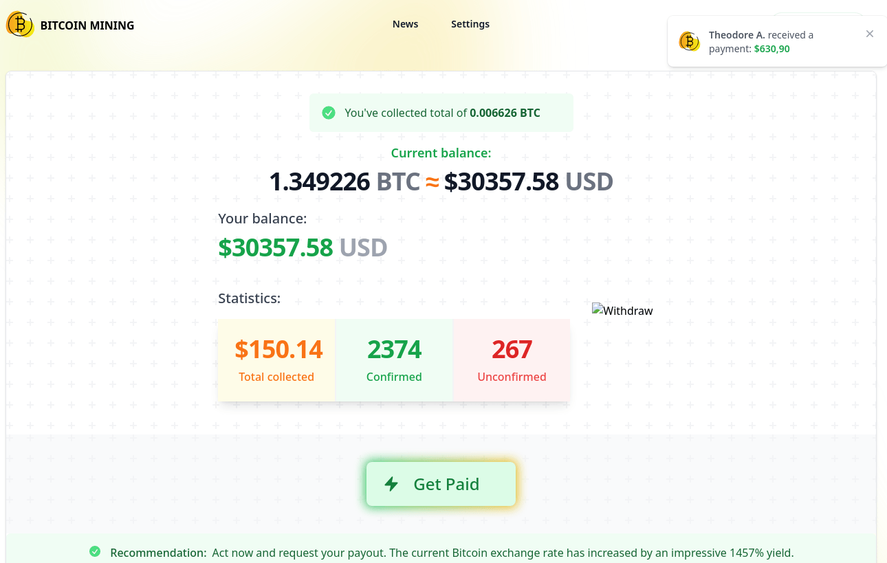 Die Fake-Seite ist überraschend detailreich und bietet viele verschiedene Bereiche, die es zu erkunden gilt. Zum Beispiel gibt es eine monatliche Übersicht über die angesammelten Beträge, eine Übersicht über die Belohnungen für einzelne Mining-Aktivitäten, eine farbige Seite, die den aktuellen Kontostand anzeigt, und sogar einen News-Bereich. Gelegentlich erscheinen darüber hinaus Benachrichtigungen in einer Ecke des Fensters, die darauf hinweisen, dass ein anderer Nutzer gerade eine hohe Auszahlung erhalten hat.