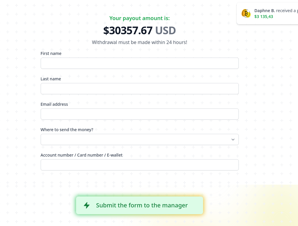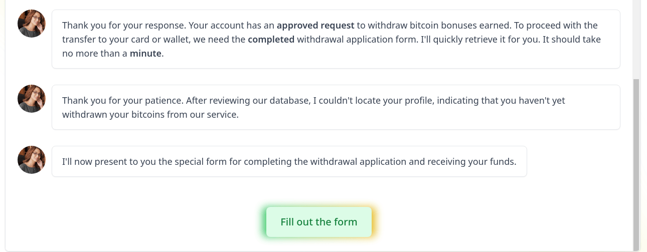 Im Fokus des Opfers steht natürlich die Schaltfläche „Auszahlung erhalten“. Ein Klick auf diese Schaltfläche führt zu einem vermeintlichen Chat zwischen dem Nutzer und einer gewissen Sophia, die anscheinend die Auszahlungsleiterin ist. Ein weiteres Formular mit Angaben zu persönlichen Daten, einschließlich der Kartennummer, muss ausgefüllt werden (vermutlich sammeln die Macher der Website diese Informationen, um sie weiterzuverkaufen).