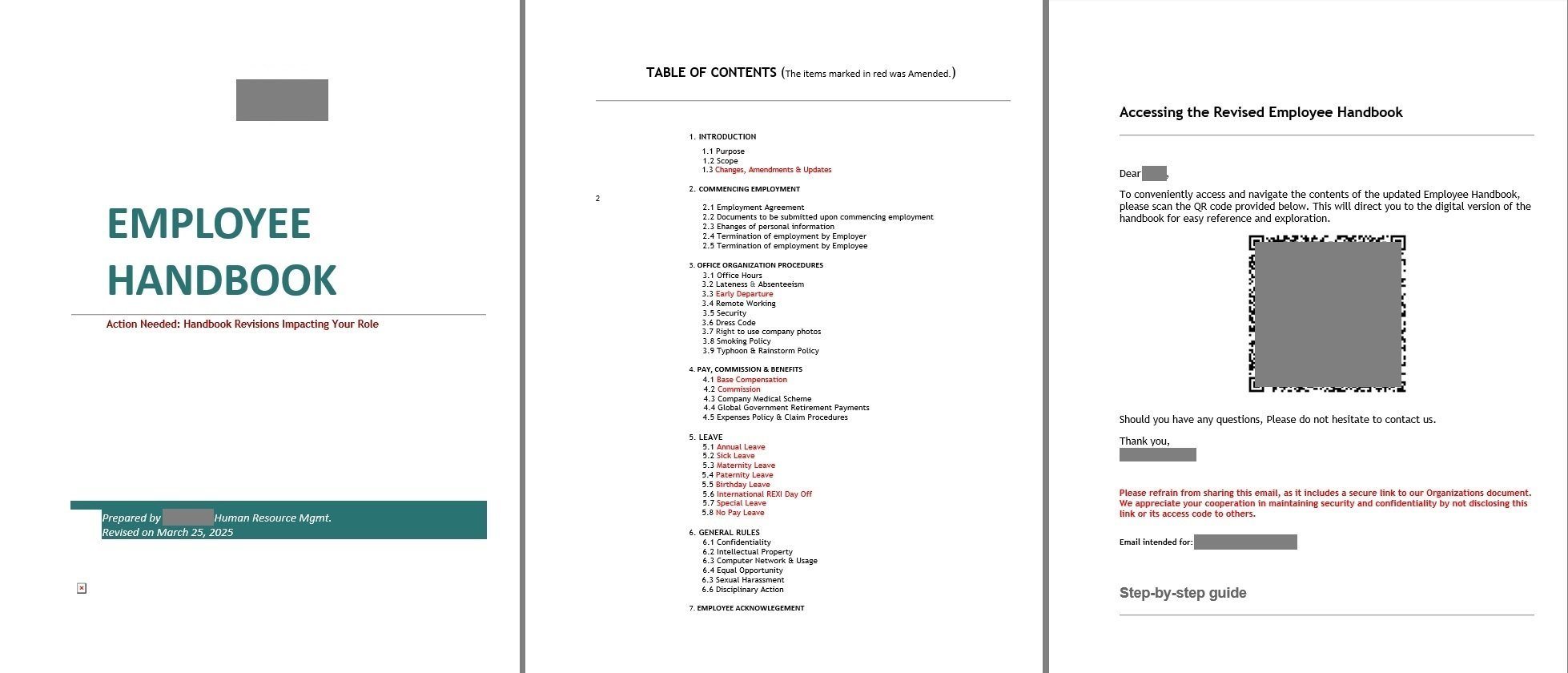 Natürlich enthält das angehängte Dokument gar keine konkreten Personalrichtlinien. Man findet nur eine Titelseite mit einem kleinen Firmenlogo und dem fett gedruckten Titel „Handbuch für Mitarbeiter“. Außerdem ist da ein Inhaltsverzeichnis, in dem Änderungen rot hervorgehoben sind, gefolgt von einer Seite mit einem QR-Code (der zum vollständigen Dokument führen soll). Zu guter Letzt wird noch in einfachen Worten erklärt, wie man QR-Codes mit dem Telefon scannt. Der Code führt zu einer Seite, auf der Anmeldeinformationen für ein geschäftliches Konto eingegeben werden sollen – genau darauf haben es die Angreifer abgesehen.