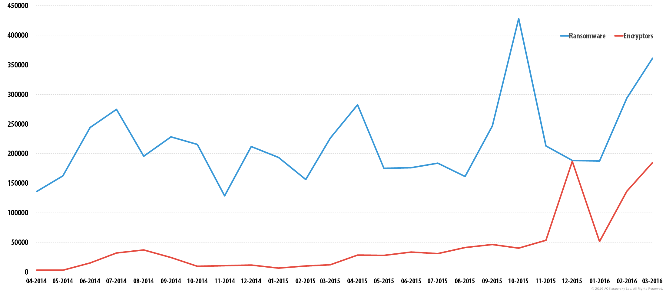 Eine Zeit lang war die neue Generation von Verschlüsselern weniger verbreitet als die alten Blocker. Aber das war nur eine Frage der Zeit: Kriminelle stiegen sehr schnell auf neue Malware um. Ende 2015 stieg die Anzahl von Ransomware-Angriffen schlagartig an.