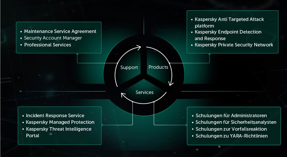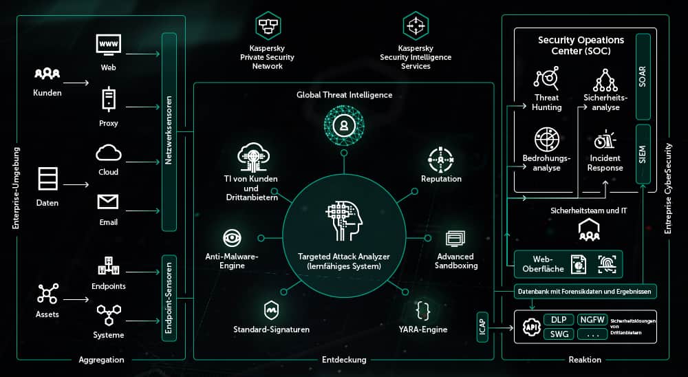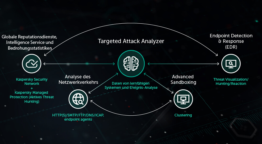 Cybersecurity muss Innovationen als Stützpfeiler der digitalen Unternehmensstrategie Innovationen fördern und zur Erkennung und Minimierung von Risiken beitragen. Die Kaspersky Anti Targeted Attack Platform ermöglicht es Unternehmen, zielgerichtete Angriffe und komplexe Bedrohungen zu erkennen und bereits befallene Systeme zu ermitteln. Sie basiert auf führenden Technologien für Security Intelligence und fortgeschrittenen lernfähigen Systemen.