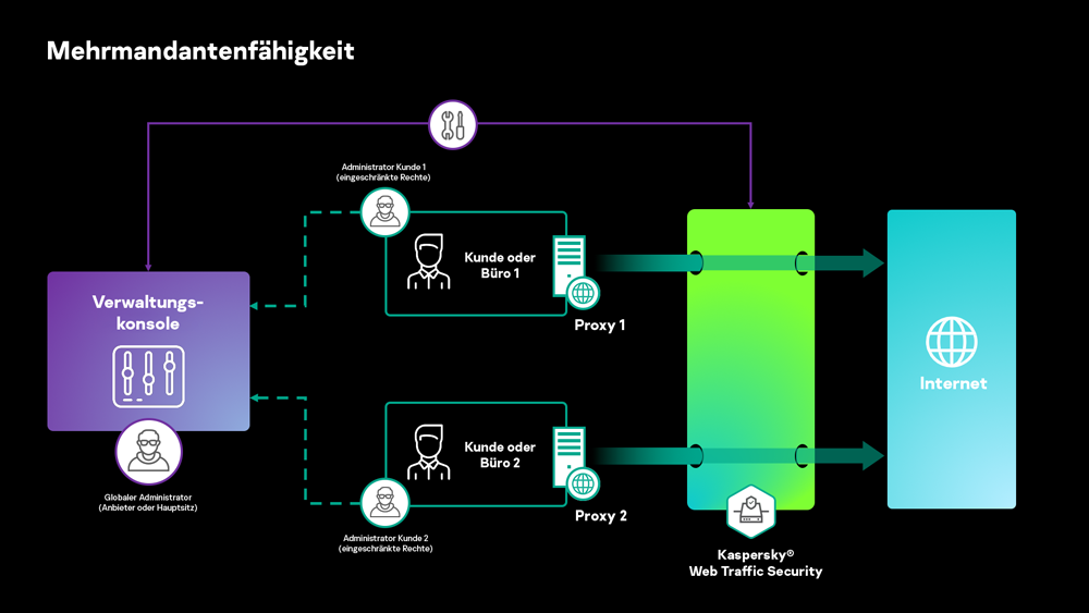 Unternehmen mit mehreren semi-unabhängigen Tochtergesellschaften oder Zweigstellen sowie IT-Sicherheitsdienstleister profitieren von Mehrmandantenfähigkeit mit unabhängiger rollenbasierter Zugriffskonfiguration.