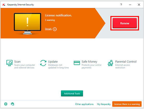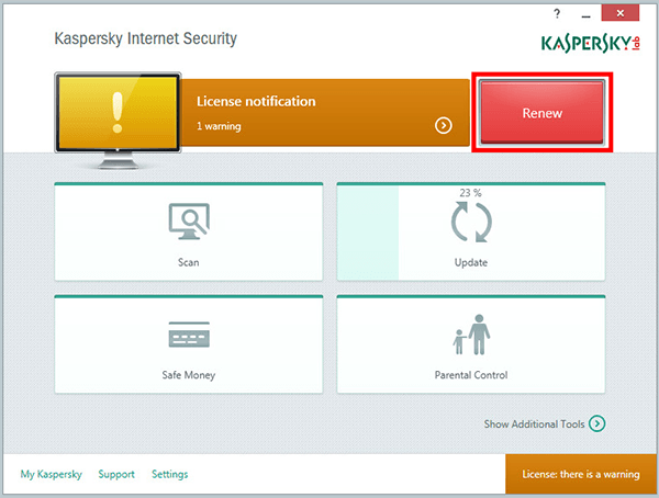 Am einfachsten lässt sich Ihr Kaspersky-Schutz direkt innerhalb des Produkts verlängern. Öffnen Sie dazu einfach Ihr Programm, und klicken Sie im Hauptfenster auf die Schaltfläche „Renew“ (Verlängern), um den Kaufvorgang zu starten.